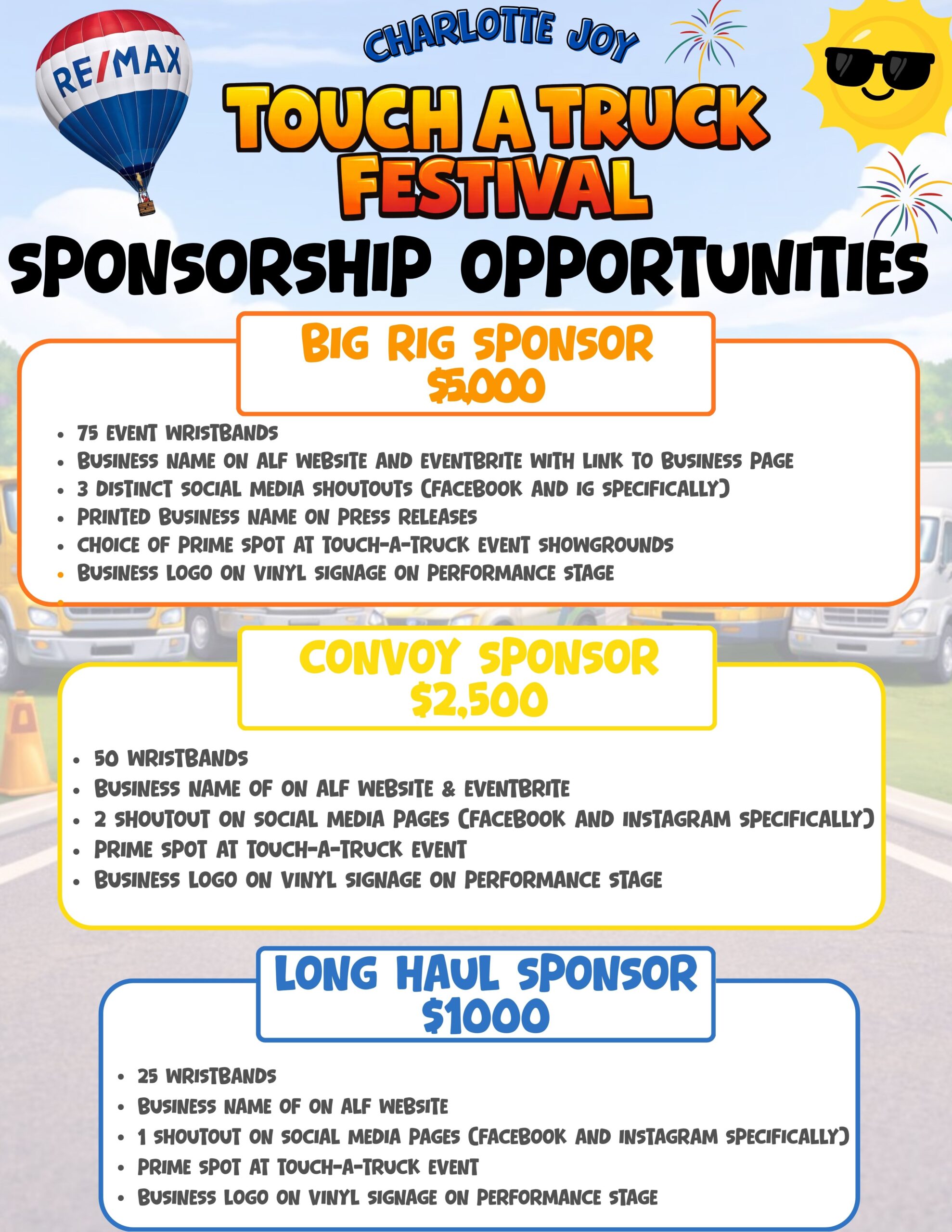 For Sponsorship Opportunities, Vendor Inquiries, or to participate as a truck/vehicle, please email Resource Director, Laura Scalese at lscalese@ashleylaurenfoundation.org  or call our office at (732)414-1625.